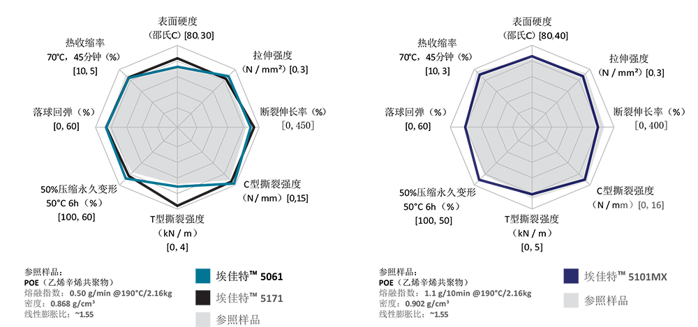 出色的發(fā)泡性能:與參照的改性劑對(duì)比中,埃佳特™ 5061,埃佳特™ 5171(左圖)和埃佳特™ 5101 MX(右圖)在關(guān)鍵特性(如壓縮永久變形,表面硬度和斷裂伸長率) 表現(xiàn)出優(yōu)異的性能。